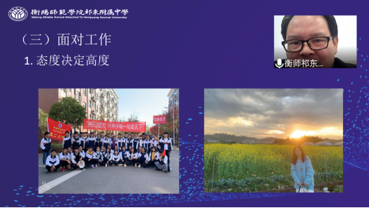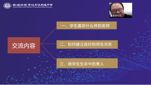 2022 年3月31日晚,数学与统计学院特邀衡阳金年会祁东附属中学的周迪云副校长在腾讯会议平台以 《树立现代教师意识,坚守立德树人使命》为主题开展第七场教育研习讲座,以进一步提升2018级师范生的教育管理能力。我院副院长李浏兰主持了本次活动,2018级数学与应用数学专业全体学生(包括南岳学院2018级数学与应用数学专业学生和数学教育研究生)积极参会。