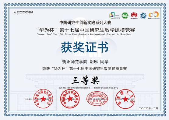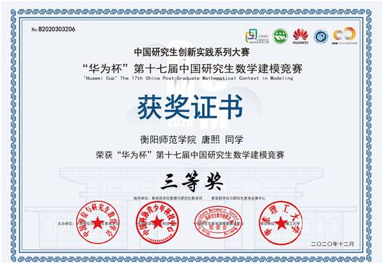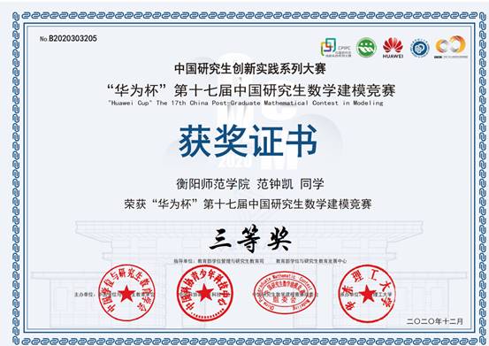 我校研究生首次参加该赛事,由周立君老师指导、数学与统计学院研究生唐熙、谢琳、物理与电子工程学院研究生范钟凯组成的参赛队伍获得全国三等奖一项。