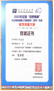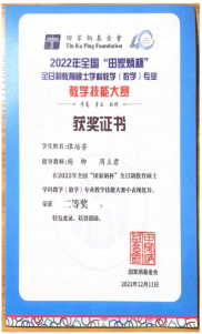 在2022年全国“田家炳杯”全日制教育硕士专业学位研究生学科教学(数学)专业教学技能大赛中,数学与统计学院3位参赛研究生均获佳绩:佘旷怡同学获得一等奖,谭培芬同学获得二等奖,罗美莹同学获得优秀设计奖,实现了该项竞赛一等奖的突破。近日,我们收到了全国教育专业学位研究生教育指导委员会颁发的获奖证书。