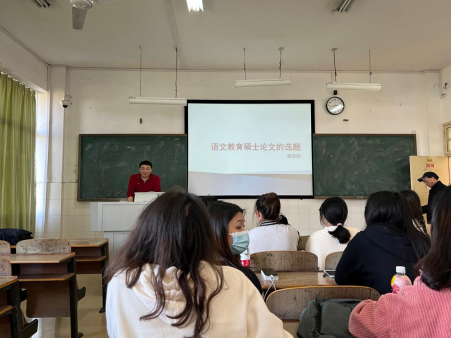 2021年11月14日下午,中国高等教育学会语文教育专家委员会副会长、湖南师范大学张良田教授应邀到文学院为2021级教育硕士做论文选题的学术讲座,会议由文学院副院长李振中教授主持,教育硕士学科教学(语文)方向全体师生参加了此次讲座,同学们认真听讲,学术氛围热烈。